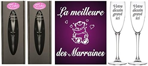 1 Flûte pour PARRAIN + 1 Flûte pour MARRAINE avec 2 Boîtes Cadeau. Un cadeau à faire lors du baptême, de la Communion (Vous pourrez accompagner ce cadeau des traditionnelles dragées). Le dessin et les textes ne sont pas modifiables - Hauteur de la Flûte 22,2 cm - Capacité 17cl - Matière : Verre - Gravure Blanche - Boutique Gravure Events spécialiste des Cadeaux originaux pour Parrain Marraine - Une article incontournable pour la préparation du Baptême de votre Enfant - Pour annoncer de façon originale le baptême de votre fille ou garçon, ou à offrir le jour J... Pensez également aux cadeaux pour les Grands parents, Papi et mamie... Nos cadeaux gravés peuvent également être offerts à d'autres occasion que le baptême : Anniversaire, Noël, annonce d'une naissance, demande parrain marraine...