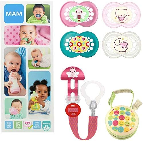 Set pratique – Cet ensemble pour bébé contenant 4 sucettes MAM aux jolis motifs, un accroche-tétines et un étui à sucettes est le cadeau idéal pour un nourrisson.