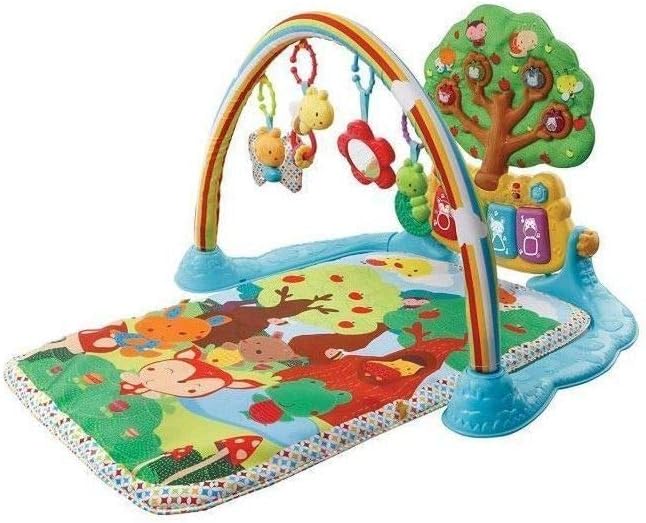 Avec un piano interactif détachable pour découvrir les formes, les couleurs et les animaux, un bouton tambour et deux petits hochets à tirer.