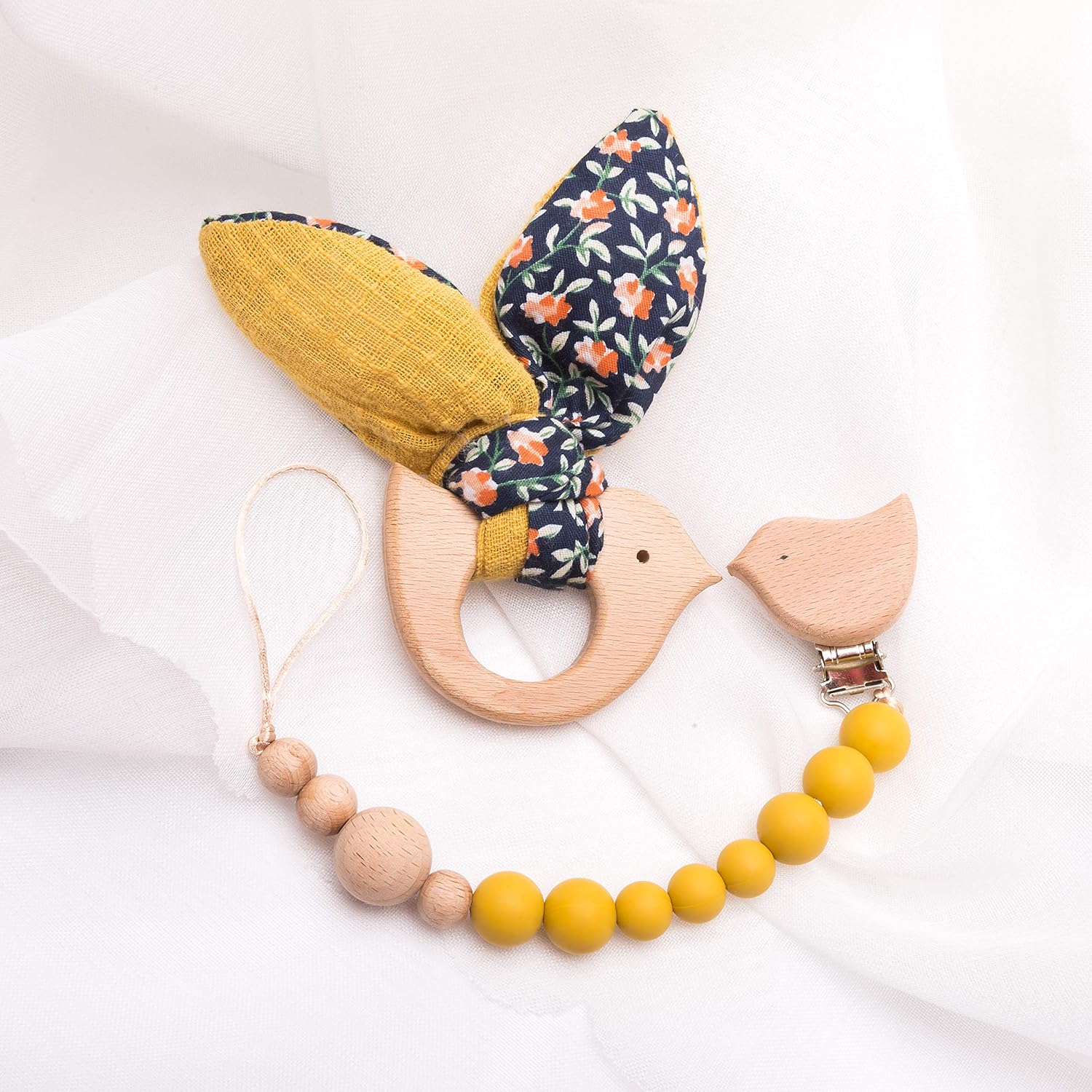 Mamimami Home 2PC Bébé En Bois Lapin Jaune ours Anneau De Dentition En Silicone Perles En Bois Oiseau Clip Tétine Jouets Montessori